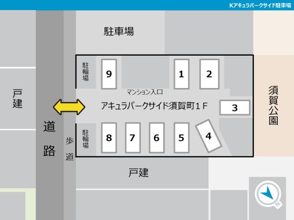 | 注意事項 | ※区画線・区画番号が見えづらい場合があります。掲載の配置図を参考に、お間違いのないように駐車してください。 |