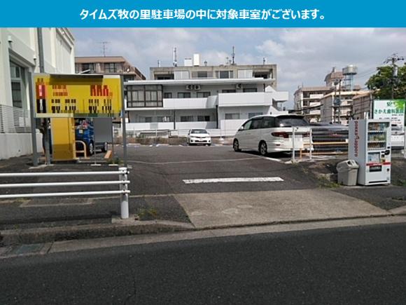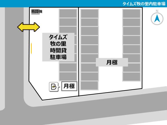 【駐車場へのご案内】 ●時間貸し「タイムズ牧の里」内の一番南側 軽自動車専用区画です。 ●駐車場西側道路が出入口です。 【駐車の際にはご注意ください】 ●時間貸し駐車区画(フラップ板あり)にはお停めにならないようにご注意下さい。 ●写真とレイアウト図を確認の上でご利用ください。 |