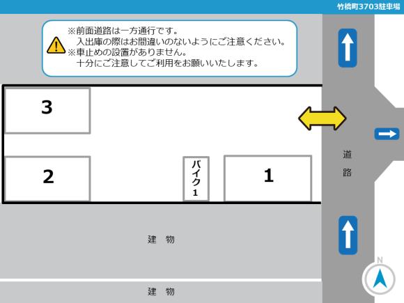 【駐車場へのご案内】 ●本ページ記載の住所で検索しても、カーナビ等で正しく表示されない場合があります。「GoogleMapsで見る」のボタンから、正しい位置をご確認ください。 【駐車の際にはご注意ください】 ●現地に記載の番号・区画線が見えづらい場合があります。掲載の配置図を参考に、お間違いのないように駐車してください。 ●アイドリングストップにご協力をお願いします。 ●前面道路は一方通行です。入出庫の際はお間違いのないようにご注意ください。 ●車止めの設置がありません。十分にご注意してご利用をお願いいたします。 |