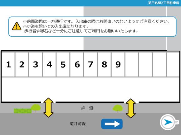 【駐車場へのご案内】 ●本ページ記載の住所で検索しても、カーナビ等で正しく表示されない場合があります。「GoogleMapsで見る」のボタンから、正しい位置をご確認ください。 【駐車の際にはご注意ください】 ●現地に記載の番号・区画線が見えづらい場合があります。掲載の配置図を参考に、お間違いのないように駐車してください。 ●アイドリングストップにご協力をお願いします。※前面道路は一方通行です。入出庫の際はお間違いのないようにご注意ください。 ●歩道を跨いでの入出庫になります。歩行者や縁石など十分にご注意してご利用をお願いいたします。 ●前面道路は一方通行です。入出庫の際はお間違いのないようにご注意ください。 |