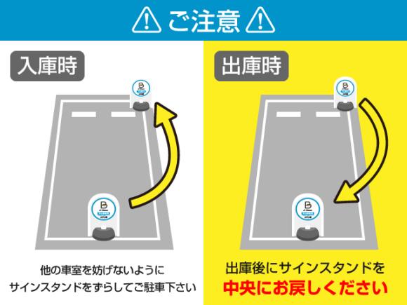 ※入庫時はサインスタンドを後方にずらして駐車してください。 ※出庫時はサインスタンドを中央前方に戻してください。 |