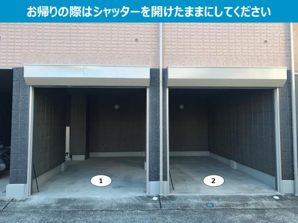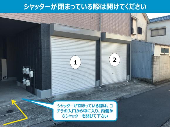 ■狭い路地の為、ゆっくり速度を落として出入りしてください。 ■駐車場への出入りの際、通行者にご注意ください。 ■シャッターが閉まっている際は、建物入口より駐車場内に入り、ロックを外してシャッターを開けて下さい ■お帰りの際はシャッターを閉める必要はありません。開けたままにしてください。 |