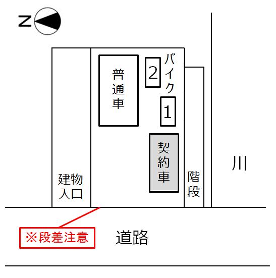 ※出入口の北側に大きな段差がありますので、入出庫の際にはご注意ください。 特に車高の低い車は地面に擦る可能性があります。 ■建物1Fの左奥に駐車スペースがあります。 ■車止めがありませんので、駐車の際には後方にご注意ください。 |