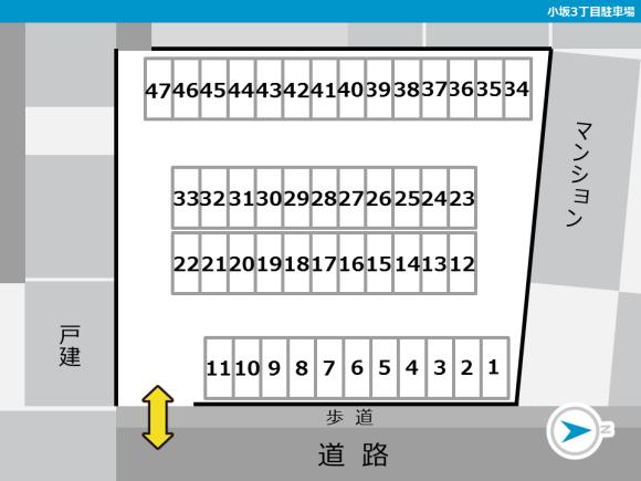 【駐車場へのご案内】 ●月極駐車内に駐車区画があります。 ●カーナビ等でピンポイントに指定されない場合は、「GoogleMapsで見る」のボタンから正しい位置をご確認ください。 【駐車の際にはご注意ください】 ●周辺道路の交通量が多く、自転車・歩行者に十分注意してください。 ●現地に記載の番号が見えづらい場合があります。駐車場情報のレイアウト写真を確認の上で指定の区画にお停めください。 ●周辺は住宅地ですので、アイドリング、夜間のドア開閉などに配慮をお願いします。 |