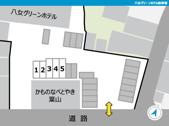 【駐車場へのご案内】 ●「八女グリーンホテル」の駐車場内です。 ●カーナビ等でピンポイントに指定されない場合は、「GoogleMapsで見る」のボタンから正しい位置をご確認ください。 【駐車の際にはご注意ください】 ●現地に記載の番号が見えづらい場合があります。駐車場情報のレイアウト写真を確認の上で指定の区画にお停めください。 ●周辺は住宅地ですので、アイドリング、夜間のドア開閉などに配慮をお願いします。 |