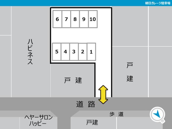 【駐車場へのご案内】 ●月極駐車場「朝日ガレージ」内に駐車区画があります。 ●カーナビ等でピンポイントに指定されない場合は、「GoogleMapsで見る」のボタンから正しい位置をご確認ください。 【駐車の際にはご注意ください】 ●周辺道路の交通量が多く、自転車・歩行者に十分注意してください。 ●現地に記載の番号が見えづらい場合があります。駐車場情報のレイアウト写真を確認の上で指定の区画にお停めください。 ●周辺は住宅地ですので、アイドリング、夜間のドア開閉などに配慮をお願いします。 |