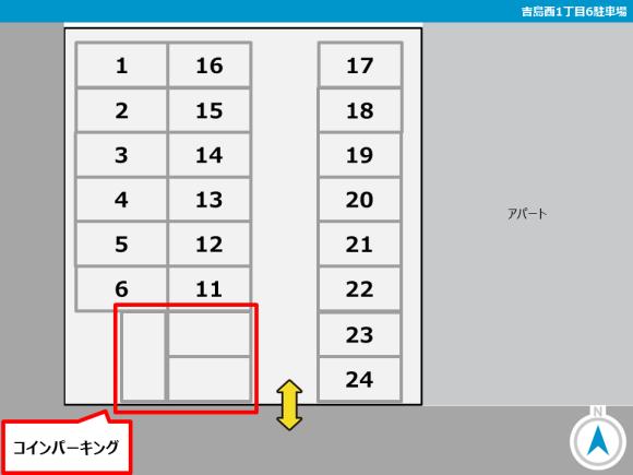 【駐車場へのご案内】 ●月極駐車場内に駐車区画があります。 ●カーナビ等でピンポイントに指定されない場合は、「GoogleMapsで見る」のボタンから正しい位置をご確認ください。 【駐車の際にはご注意ください】 ●周辺道路の交通量が多く、自転車・歩行者に十分注意してください。 ●現地に記載の番号が見えづらい場合があります。駐車場情報のレイアウト写真を確認の上で指定の区画にお停めください。 ●周辺は住宅地ですので、アイドリング、夜間のドア開閉などに配慮をお願いします。 |