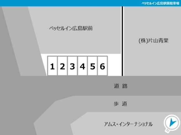 【駐車場へのご案内】 ●「ベッセルイン広島駅前」の駐車場内です。 ●カーナビ等でピンポイントに指定されない場合は、「GoogleMapsで見る」のボタンから正しい位置をご確認ください。 【駐車の際にはご注意ください】 ●駐車場情報のレイアウト写真を確認の上で指定の区画にお停めください。 |