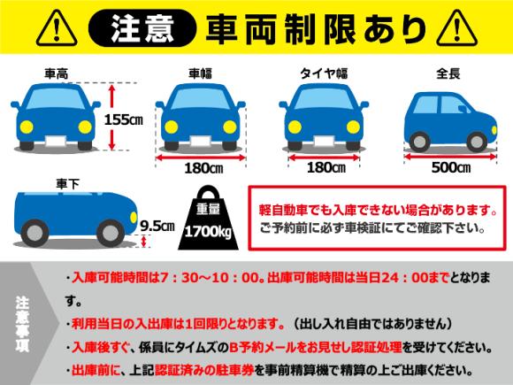 ▼ご予約前の注意事項▼ ◇サイズ制限がある駐車場です。車検証等で事前に【車高・全長・車幅・重量七度】を必ずご確認の上ご予約してください。 ◇ご来場時、万が一サイズ制限によって駐車出来なかった場合、ご返金は出来ませんのでご注意ください。 ◇時間制限がある駐車場です。利用可能時間をご確認ください。 ◇利用日13日前から前日の22時まで予約可能です。当日のご予約はできません。 ▼ご利用時の注意事項▼ ◇入庫可能時間は7時半~10時となります。10時以降の入庫の場合、本予約料金と駐車場の通常料金を二重にお支払いいただき、返金はございません。 ◇車両ナンバーで予約情報を照合します。必ずご利用前にナンバー登録をお願いします。登録されてない場合、駐車場利用ができない場合がございますのでご注意ください。 ◇駐車場に入庫直後に必ず「タイムズのBで予約済み」であることを係員に伝え、本メールまたはマイページの予約画面を提示して認証処理を行なってください。認証処理なく事前精算された場合、返金はございません。 ◇出庫前には事前精算機にてご精算ください。その後15分以内にご出庫ください。15分を超えて出庫する場合超過料金が発生いたします。 ◇当駐車場は出入り自由ではありません。一度出庫すると再入庫できません。 ◇必ず当日24:00までに出庫してください。 |