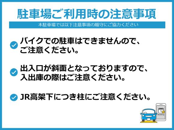 ■バイクでの駐車できません。お気を付け下さい。 ■JR高架下につき柱にご注意ください。 ■出入口が斜面となっております。ご注意下さい。 |
