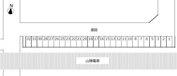 ※山陽電車 線路北側の駐車場です。 ■カーナビ等では詳細の場所が指定されませんので、地図をご確認の上でお越しください。 ■指定区画以外は契約車がいますので、レイアウト図を確認の上で指定区画番号にお停め下さい。 ■車室後方に会社名や個人名等の表記が残っている場合がございますが、お気になさらず指定された番号へ駐車してください。 |