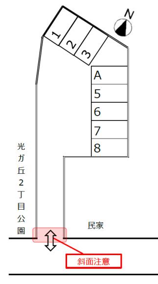 ※出入口が斜面になっていますので、車高の低い車や外国車の出入りにご注意ください。 ※駐車場までの通路幅が3.2mです。出入りの際には車幅にご注意ください。 ・区画に番号は後方の壁にかかれいます。 ・指定区画以外は契約車がいますので、レイアウト写真をご確認の上で、必ず指定の区画にお停め下さい。 |