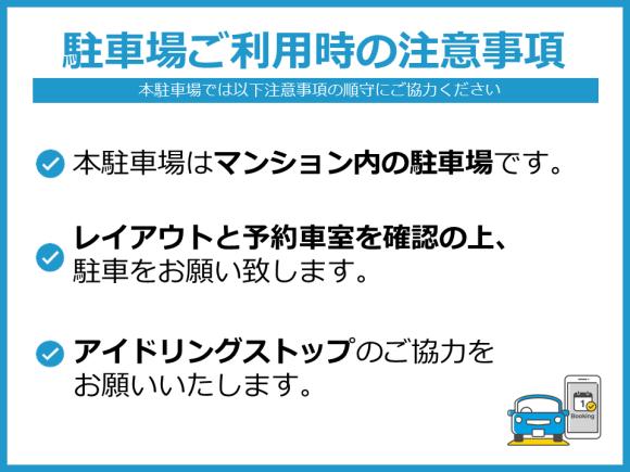【駐車場へのご案内】 ●マンション内の駐車場です。 ●カーナビ等でピンポイントに指定されない場合は、「GoogleMapsで見る」のボタンから正しい位置をご確認ください。 【駐車の際にはご注意ください】 ●現地に記載の番号が見えづらい場合があります。駐車場情報のレイアウト写真を確認の上で指定の区画にお停めください。 ●周辺は住宅地ですので、アイドリング、夜間のドア開閉などに配慮をお願いします。 |