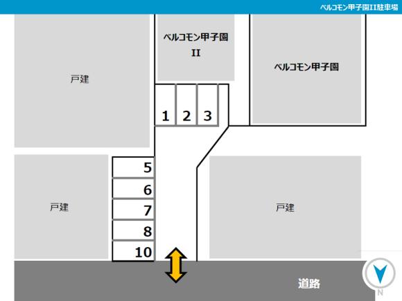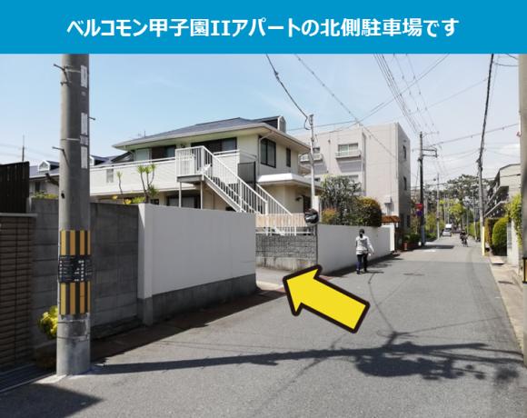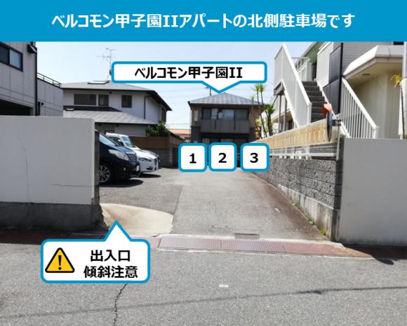 ※1番、2番、3番車室は前向き駐車をお願いします。 【駐車場へのご案内】 ●ベルコモン甲子園アパート2北側の駐車場です。 ●本ページ記載の住所で検索しても、カーナビ等で正しく表示されない場合があります。「GoogleMapsで見る」のボタンから、正しい位置をご確認ください。 【駐車の際にはご注意ください】 ●出入口に傾斜がありますので、車高の低い車はご注意ください。 ●駐車場情報のレイアウト図と写真を確認の上で指定場所にお停め下さい。 ●アイドリングストップにご協力をお願いします。 【出庫の際にご注意ください】 ●道路に出る際に左右が見えずらいため、ゆっくり慎重に道路に出るようお願いいたします。 |