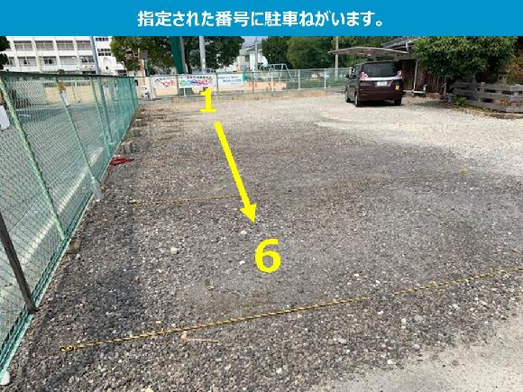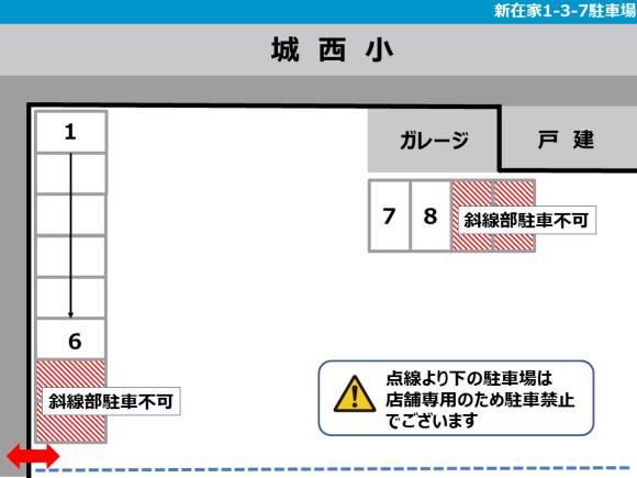 【駐車場へのご案内】 ●写真に掲載しております黄色い線が、ルートになります。写真を参考に出庫、駐車をお願いします。 ●本ページ記載の住所で検索しても、カーナビ等で正しく表示されない場合があります。「GoogleMapsで見る」のボタンから、正しい位置をご確認ください。 ●駐車場入り口への進入路が狭くなっていますので、通行時は歩行者等に充分ご注意ください。 ●前面道路が、狭くなっておりますので駐車の際はご注意願います。 ●レイアウト図の点線部分より下の駐車場は、店舗専用になります。 【駐車の際にはご注意ください】 ●駐車場内の通行時は、歩行者・他の車両に充分ご注意ください。 ●掲載の配置図を参考に、お間違いのないように駐車してください。 |