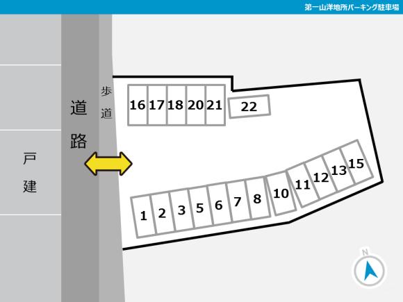 【駐車場へのご案内】 ●写真に掲載しております黄色い線が、ルートになります。写真を参考に出庫、駐車をお願いします。 ●本ページ記載の住所で検索しても、カーナビ等で正しく表示されない場合があります。「GoogleMapsで見る」のボタンから、正しい位置をご確認ください。 ●駐車場入り口への進入路が狭くなっていますので、通行時は歩行者等に充分ご注意ください。 ●指定された番号に駐車願います。 ●前面道路が、狭くなっておりますので駐車の際はご注意願います。 【駐車の際にはご注意ください】 ●駐車場内の通行時は、歩行者・他の車両に充分ご注意ください。 ●掲載の配置図を参考に、お間違いのないように駐車してください。 |