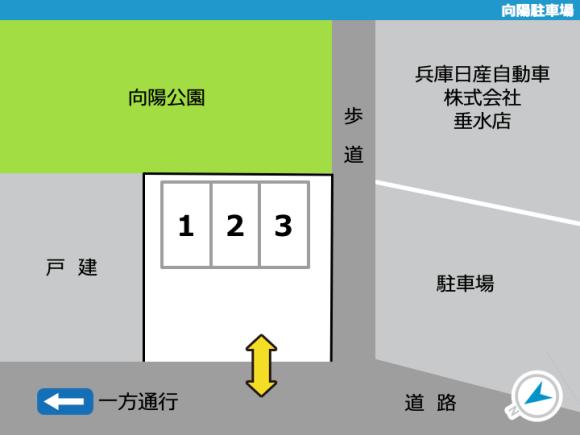 兵庫県神戸市垂水区向陽1丁目2-5向陽駐車場(Google Maps) ※住所をナビに入れても正しく表示されない場合があります。 |