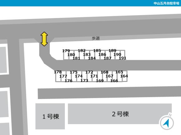 ※不正駐車防止等のため定期巡回を行っています。巡回スタッフが撮影・お声が けさせていただく場合がありますことご了承ください。 ※広い敷地のため、駐車前に駐車位置(指定区画番号)を確認してください。 ※指定区画以外には月極契約者がいますので、必ず指定区画を確認してお停めく ださい。 ※周辺住宅のご迷惑にならないよう、アイドリングストップにご協力をお願いし ます。 ※団地内は徐行運転で安全に通行をお願いします。 |