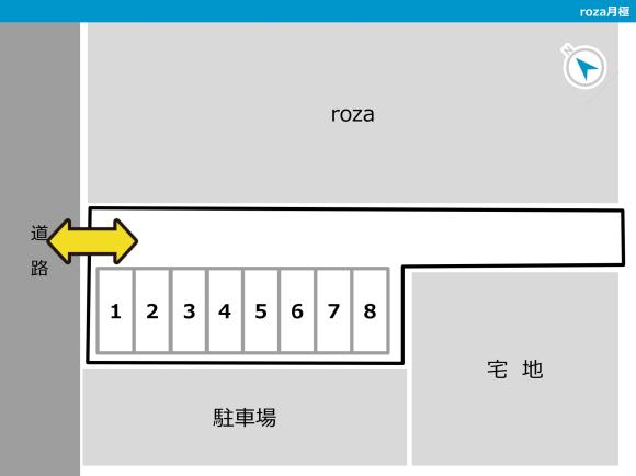 【駐車場へのご案内】 ※「ROZA月極駐車場」内です。 【駐車の際にはご注意ください】 ※予約確認メールに記載された区画番号とレイアウト図を確認の上で指定場所にお停めください。 ※周辺住宅のご迷惑にならないよう、アイドリングストップにご協力をお願いします。 月極契約も募集しております。 |