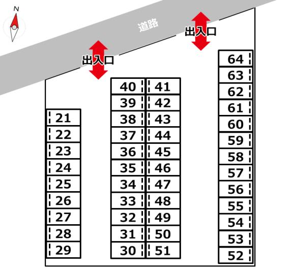 駐車場の看板はありません。 入り口が複数あります。 21番から40番の方は、自動販売機がある黄色い鉄柱の入り口 41番から62番の方は、黄色い鉄柱の向かって左側になります 地図と写真をよく確認してください。 駐車スペースよく確認して、間違えないようにお願いします。 大型SUV車など、横幅が190cmを越える車はとめられません |