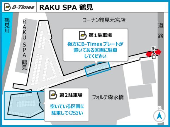 ※本駐車場は「RAKU SPA 鶴見」の店舗駐車場内です。 ※0時1分~7時59分はタイムズのBはご利用できません。駐車しないようご注意ください。 ※予約専用区画後方のフェンスに、タイムズのBのロゴが設置されています。 ※予約完了メールに記載の内容に従い、お間違いのないように駐車してください。 ※巡回職員からお声掛けさせていただく場合があります。その際には、予約完了メールのご提示等、ご協力をお願い致します。 ※駐車場入口がカラーコーンで封鎖されている場合は、カラーコーンを移動し入庫してください。 |