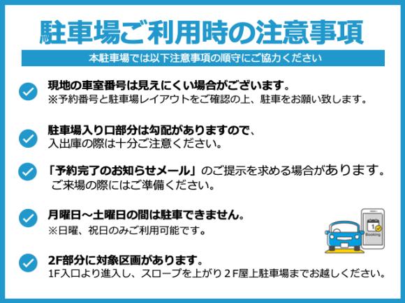 ・駐車スペースはスロープを上がった先にございます。 ・日曜、祝日のみご利用いただけます。 |