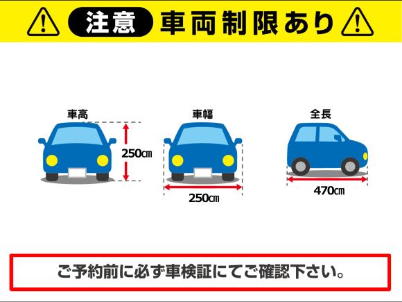 ▼▼ご予約前の注意点▼▼ ※時間をオーバーした場合は現地にて超過分の利用料金を徴収致します。 ※宿泊料金について 1泊あたりの宿泊料金については現地精算となります、料金は現地にてご確認下さい ◆車両制限 平面駐車区画ですが、高さ制限(2.5m)があります 改造車は車両制限内でも入庫できない場合があります、ご予約はお控えください 車両制限超過や車両改造により入庫を断られた場合、利用料金の返金はできません 事業用車両(黒・緑ナンバー)のご利用不可 ◆宿泊(2日以上)利用 2日以上続けて駐車(停めっぱなし)可能 駐車する期間(入庫日から出庫日まで)をご予約ください 1泊あたりの宿泊料金については現地精算となります、料金は現地にてご確認ください ◆入出庫不可時間 平日「22:30~翌7:30」 土日祝「22:30~翌9:00」は入出庫不可 ◆利用当日の入出庫 利用当日の入出庫は自由です ※出し入れ回数に制限はありません 2回目以降の入庫は時間貸しの料金をお支払いください ▼▼ご利用時の注意点▼▼ ◆入庫方法 「タイムズのB予約済」と係員に伝え、予約完了メールかマイページの予約詳細をご提示ください ◆出庫方法 係員にお声かけください ▼▼その他▼▼ 人気駐車場の為、時間貸し料金より高額な場合があります |