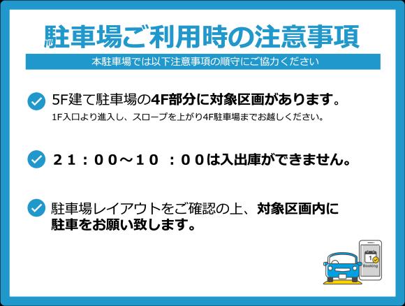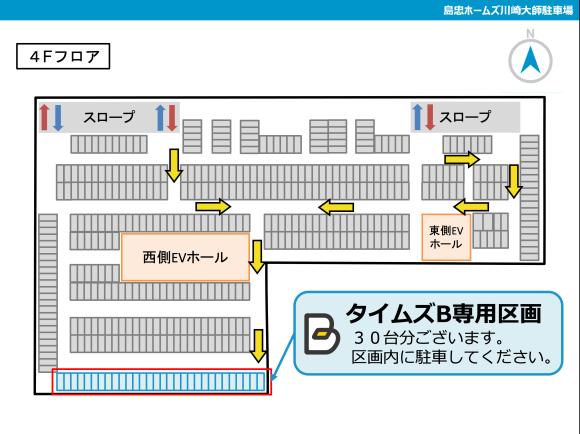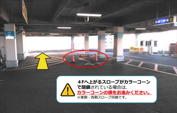 ※21:00-10:00は入出庫ができません。ご注意ください※ 【ご利用の流れ】 ・駐車券等はございません。入出庫の際は、そのままお進みください。 ・3Fから4Fへ上るスロープが、カラーコーンで封鎖されている場合がございます。 その際は、カラーコーンの横をお進みいただき、4Fへお上りください。 ・タイムズB予約専用区画は、立体駐車場4Fの西側にございます。 詳細はレイアウトをご確認の上、対象区画内に駐車をお願いいたします。 ・車室番号はございませんので、対象区画内のお好きな車室にご駐車ください。 【注意事項】 ・21:00-10:00は入出庫ができません。 ・連日予約(留め置き)は可能でございますが、入出庫の時間帯にご注意ください。 ・予約時間を超過した際は、タイムズのBコンタクトセンターまでご連絡ください。 コンタクトセンターの連絡先は予約確認メールの「▼よくあるご質問で解決しない場合」よりご確認ください。 ※現地の精算機でお支払いは行わないでください。 |