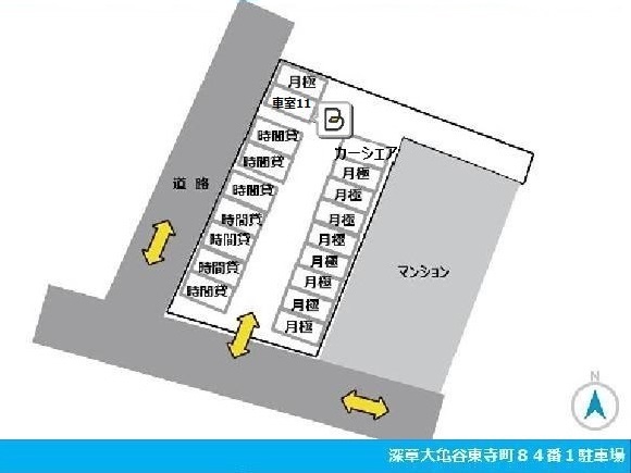【駐車場へのご案内】 ●写真に掲載しております黄色い線が、ルートになります。写真を参考に出庫、駐車をお願いします。 ●本ページ記載の住所で検索しても、カーナビ等で正しく表示されない場合があります。「GoogleMapsで見る」のボタンから、正しい位置をご確認ください。 ●駐車場入り口への進入路が狭くなっていますので、通行時は歩行者等に充分ご注意ください。 ●Bマークがございます車室になります。 【駐車の際にはご注意ください】 ●駐車場内の通行時は、歩行者・他の車両に充分ご注意ください。 |