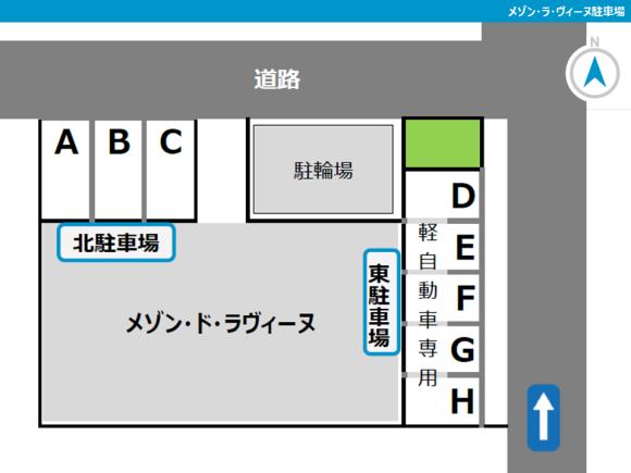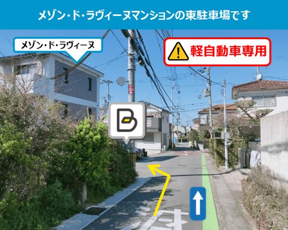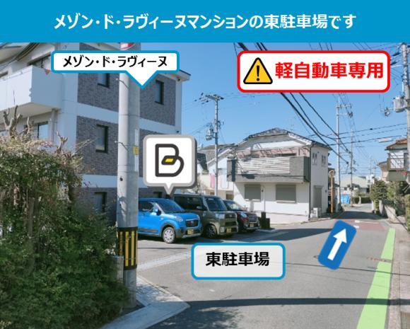 ※軽自動車専用です。 【駐車場へのご案内】 ※メゾン・ド・ラヴィーヌマンションの東側駐車場です。 ※現地周辺の道路が非常に狭いため、注意してお越しください。 【駐車の際にはご注意ください】 ※現地の区画表示が見えにくいため、レイアウト図を確認して指定場所にお停めください。。 ※周辺住宅のご迷惑にならないよう、アイドリングストップにご協力をお願いします。 |