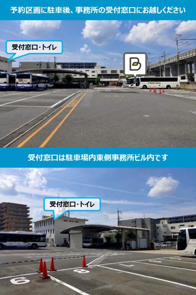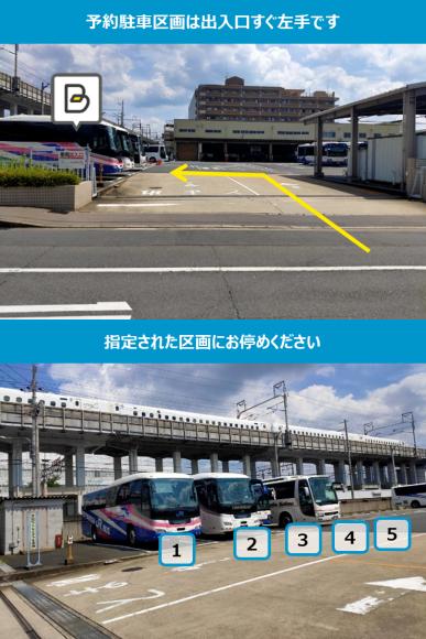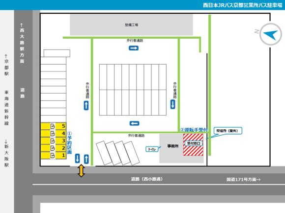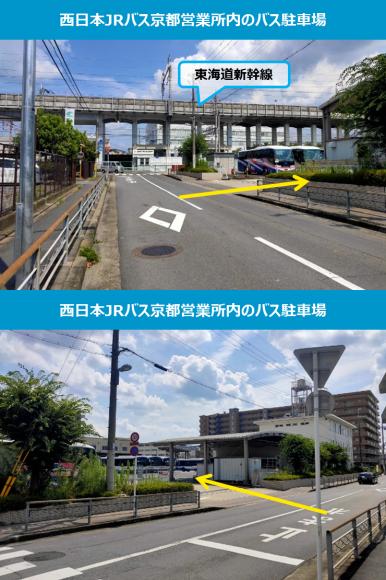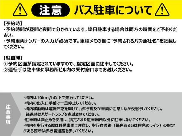 ※バス専用、乗用車は予約不可 ※7時から21時までの駐車が可能です。 【予約時】 ・予約車両ナンバーの入力が必須です。車種メモの欄に”予約されるバス会社名”を記載してください。同じ欄に”到着予定時刻”も記載いたけますようお願いいたします。 ・駐車可能時間の制限があります。留め置き(宿泊駐車)はできません。 【駐車場へのご案内】 ・西日本JRバス京都営業所バス駐車場内の指定区画です。 【駐車時にはご注意ください】 ・予約駐車エリアが指定されていますので、必ず予約確認メールに記載されている区画番号にお停めください。 ・バス内掲示用の駐車証をお渡ししますので、駐車後に受付窓口までお越しください。 ・構内でのお客様乗降はご遠慮ください。 【駐車場内注意事項】 ・構内は10km/h以下で走行してください。 ・構内の出入口手前で一旦停止してください。 ・構内移動時は運転席窓を開けて、歩行者及び車両に注意しながら走行してください。 ・後退時はハザードランプを点滅させてください。 ・駐車時は歯止めを使用し、指定された駐車場所以外に駐車しないでください。 ・構内を歩行する際は移動車両に注意し、歩行者通路(緑色あるいは橙色のライン)の指定がある箇所は歩行者通路を歩いてください。 |