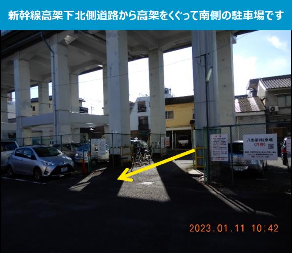 ※4番から11番の区画は、近隣住宅への配慮から「前向きに駐車」をお願いします。 【駐車場へのご案内】 ※東側(大宮通)からの道路が狭いため、西側(壬生通)から駐車場までお越しください。カーナビによっては狭い道を案内されることがあるためご注意ください。 ※新幹線高架北側から、高架をくぐって南側に駐車場があります。 【駐車の際にはご注意ください】 ※指定区画以外には月極契約車がいるため、必ず指定番号にお停め下さい。 ※周辺は住宅地ですので、アイドリング、夜間のドア開閉などに配慮をお願いします。 当駐車場はB利用と月極契約とを並行して募集しているため、万が一双方のお申し込みがバッティングしてしまった際にはご利用いただけない可能性がございます。恐れ入りますが予めご了承のうえご予約をお願いいたします。 |