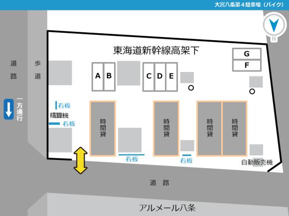 ※バイク専用駐輪場です。 【駐車場へのご案内】 ※新幹線高架下のバイク駐輪場です。 ※道路側に時間貸し駐車場「タイムズ大宮八条第4」があり、東側通路から奥に進むとバイクスペースがあります。 【駐車の際にはご注意ください】 ※指定区画以外には月極契約車がいるため、必ず指定番号にお停め下さい。 ※周辺は住宅地ですので、アイドリングに配慮をお願いします。 |