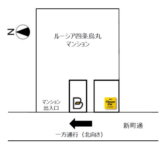 マンション下 1F北側の駐車場です。南側はカーシェアリングの駐車場ですので、ご注意ください。 前面道路は北向きの一方通行です。 |