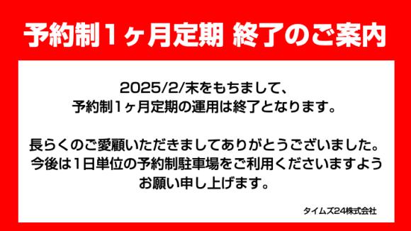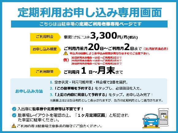 -------------------------------------- 2025/2/末をもちまして、 予約制1ヶ月定期の運用は終了となります。 長らくのご愛顧いただきましてありがとうございました。 今後は1日単位の予約制駐車場をご利用くださいますよう お願い申し上げます。 -------------------------------------- ※定期利用申し込み専用画面です ・販売期間:ご利用月の前月20日からご利用月2日まで(利用日はご利用月2日を選択してください) ・利用期間:ご利用月1日から末日まで(ご利用月の前月20日から末日は利用できません ) ・ご利用月2日以降のキャンセル不可(ご利用月2日以降は、キャンセルをしても全額利用者負担となり、払い戻しはできません。) ※駐車場内を定期巡回しています。お申込み時は、お車のナンバーは必ずお間違えのないよう入力をお願い致します。 |