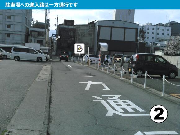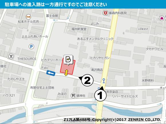 上戸劇場横!松本城・市役所近く、観光・日常利用にもとっても便利な立地!駐車場入口は一方通行に面しています。