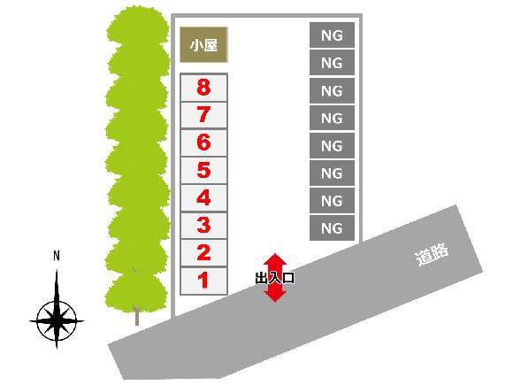 ●掲載の配置図を参考に間違いのないように駐車してください。 ●予約可能日以外は、契約車両が駐車しますので、延長のないように充分ご注意ください。 |