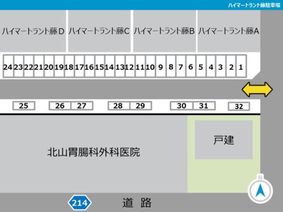 【駐車場へのご案内】 ●マンション「ハイマートラント藤」の駐車場内です。 ●カーナビ等でピンポイントに指定されない場合は、「GoogleMapsで見る」のボタンから正しい位置をご確認ください。 【駐車の際にはご注意ください】 ●現地に記載の番号が見えづらい場合があります。駐車場情報のレイアウト写真を確認の上で指定の区画にお停めください。 ●周辺は住宅地ですので、アイドリング、夜間のドア開閉などに配慮をお願いします。 |