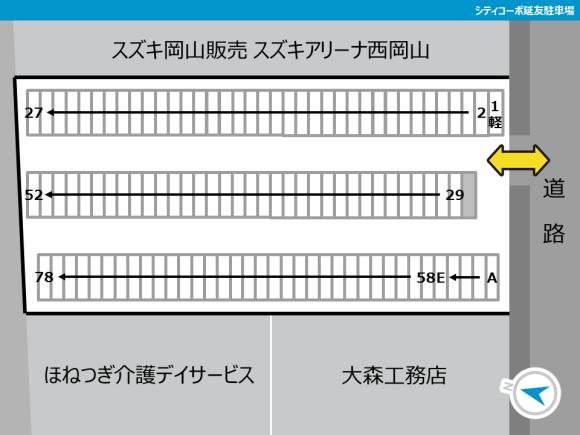 【駐車場へのご案内】 ●マンション「シティコーポ延友」専用の駐車場内です。 ●カーナビ等でピンポイントに指定されない場合は、「GoogleMapsで見る」のボタンから正しい位置をご確認ください。 【駐車の際にはご注意ください】 ●現地に記載の番号が見えづらい場合があります。駐車場情報のレイアウト写真を確認の上で指定の区画にお停めください。 ●周辺は住宅地ですので、アイドリング、夜間のドア開閉などに配慮をお願いします。 |