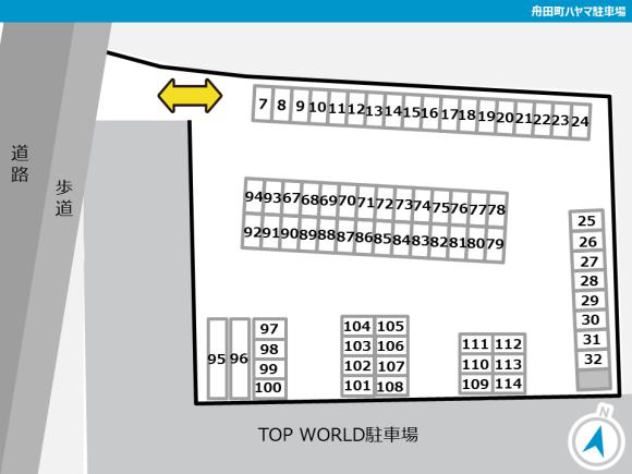 ご利用の際は、トップワールド(スーパーマーケット)のコインパーキングには入らず、手前の「舟田町ハヤマ駐車場」と記載のある駐車場へお越しください。