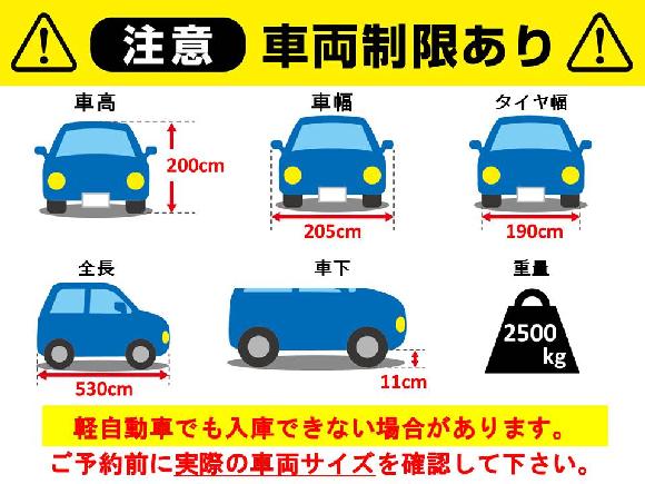 ※入出庫可能時間: 平日8:00-22:00 (22:00-翌8:00は入出庫不可) 土日祝9:00-22:00 (22:00-翌9:00は入出庫不可) ▽予約前▽ ◆車両制限 ・実際の車両サイズを必ずご確認の上ご予約ください。 ・改造車は車両制限内でも入庫できない可能性があります。ご予約はお控え下さい。 ・上記理由などで入庫できなかった場合、料金の返金はできません。 ◆入出庫可能時間 ・平日8時-22時、土日祝9時-22時です。 ◆利用当日の再入庫・複数回入出庫はできません、2回目以降は一般車両の料金をお支払い下さい。 ※車両のナンバーで予約を管理しているため、予約時にナンバー入力が必須です。 ▽利用時▽ ◆入庫方法 ・予約済みであることを駐車場係員に伝え、予約完了メールか予約画面を提示下さい。 ◆出庫方法 ・係員の指示に従い出庫下さい。 ◆予約時間超過時の追加料金 ・予約いただいた時間を超過して駐車された場合は現地にて精算してください。 提携店舗の割引等は利用できません。 |