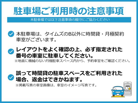 ■地面に機器がない、月極の駐車スペースをご利用ください。 ■誤って時間貸の駐車スペースをご利用された場合、返金はできかねます。 ■付近の駐車スペースに月極契約が入っておりますので、必ず指定された場所の枠線内に駐車してください。 |