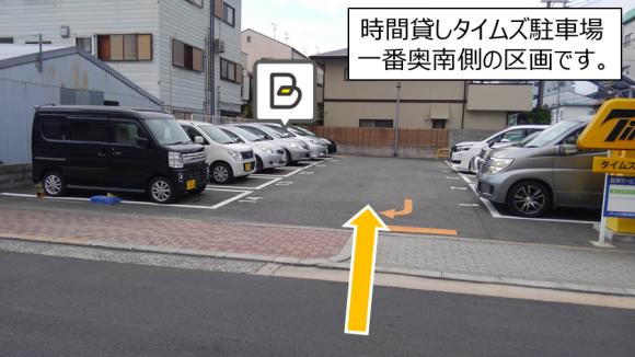 ※時間貸しタイムズの中、一番奥南側の月極専用区画です。 駐車バリケードを移動させてご利用下さい。 ご利用後は元に戻していただくようお願いします。 ・時間貸し駐車場の料金と異なる場合があります。 ・ナビで検索してもピンポイントに表示されない可能性がありますので、その際にはタイムズのB上に地図を参考にお越しください。 ・駐車場出入口は東側(南向き一方通行道路沿い)です。 ・周辺は住宅地ですので、アイドリング、夜間のドア開閉などに配慮をお願いします。 |