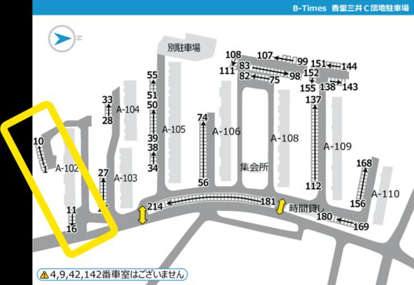 ■近隣に似た名前の団地がありますが、当駐車場は【香里三井C団地】の駐車場となっております。 ■団地内に一方通行がある場合は必ず守って走行してください。 ■現地に到着した際は、必ずタイムズのBの写真や配置図をご確認の上、駐車してください。 間違って他の利用者の場所に駐車しないよう、お気を付けください。 ■団地内駐車場となりますので、アイドリング・喫煙・ポイ捨てはご遠慮くださ い。 <ご予約した区画に不正車両が止まっていた場合> 下記をご参照の上、空き車室の照会・振替および不正駐車情報のご入力をお願いいたします。 https://btimes.jp/guide/rent_illegalpark.html |