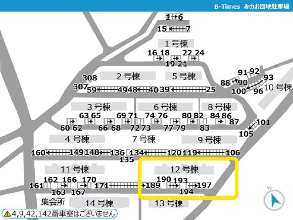 ■団地内に一方通行がある場合は必ず守って走行してください。 ■現地に到着した際は、必ずタイムズのBの写真や配置図をご確認の上、駐車してください。 間違って他の利用者の場所に駐車しないよう、お気を付けください。 ■団地内駐車場となりますので、アイドリング・喫煙・ポイ捨てはご遠慮くださ い。 <ご予約した区画に不正車両が止まっていた場合> 下記をご参照の上、空き車室の照会・振替および不正駐車情報のご入力をお願いいたします。 https://btimes.jp/guide/rent_illegalpark.html |