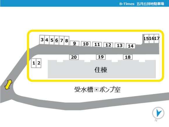 ※団地建物の東側に駐車場入り口があります。 ■ナビの場合は「池田市五月丘3丁目1-9」の住所を登録して頂くと、近隣までたどり着けます。 ※ナビによっては登録されていないケースもございます。 ■現地に到着した際は、必ずタイムズのBの写真や配置図をご確認の上、駐車してください。 間違って他の利用者の場所に駐車しないよう、お気を付けください。 <ご予約した区画に不正車両が止まっていた場合> 下記をご参照の上、空き車室の照会・振替および不正駐車情報のご入力をお願いいたします。 https://btimes.jp/guide/rent_illegalpark.html |