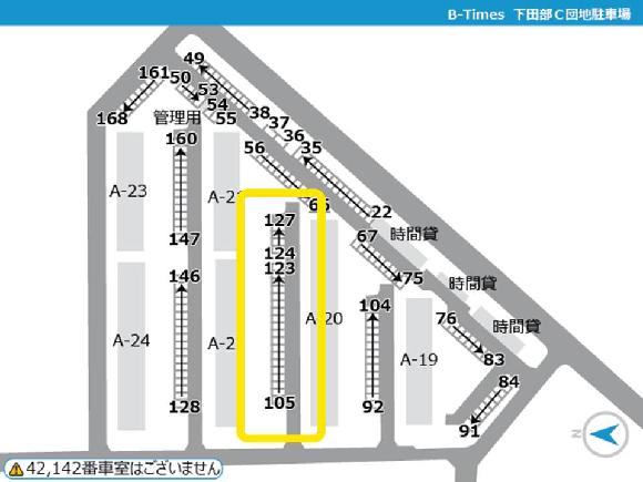 ■近隣に似た名前の団地がありますが、当駐車場は【下田部C団地】の駐車場となっております。 ■団地内に一方通行がある場合は必ず守って走行してください。 ■現地に到着した際は、必ずタイムズのBの写真や配置図をご確認の上、駐車してください。 間違って他の利用者の場所に駐車しないよう、お気を付けください。 ■団地内駐車場となりますので、アイドリング・喫煙・ポイ捨てはご遠慮くださ い。 <ご予約した区画に不正車両が止まっていた場合> 下記をご参照の上、空き車室の照会・振替および不正駐車情報のご入力をお願いいたします。 https://btimes.jp/guide/rent_illegalpark.html |