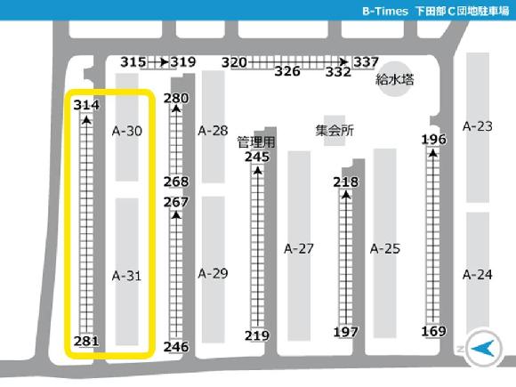 ■近隣に似た名前の団地がありますが、当駐車場は【下田部C団地】の駐車場となっております。 ■団地内に一方通行がある場合は必ず守って走行してください。 ■現地に到着した際は、必ずタイムズのBの写真や配置図をご確認の上、駐車してください。 間違って他の利用者の場所に駐車しないよう、お気を付けください。 ■団地内駐車場となりますので、アイドリング・喫煙・ポイ捨てはご遠慮くださ い。 <ご予約した区画に不正車両が止まっていた場合> 下記をご参照の上、空き車室の照会・振替および不正駐車情報のご入力をお願いいたします。 https://btimes.jp/guide/rent_illegalpark.html |