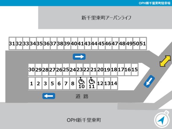 ■団地内に一方通行がある場合は必ず守って走行してください。 【駐車場へのご案内】 ※OPH新千里東町の北側駐車場です。 ※住宅の東側道路が出入口です。 【駐車の際にはご注意ください】 ※広い駐車区画のため、事前に駐車位置(指定区画番号)を確認の上でお越しください。 ※駐車場内は一方通行です。 ※現地の車室番号とレイアウト図をご確認の上でお停めください。 ※団地駐車場のため、アイドリング、夜間のドア開閉などに配慮をお願いします。 ■団地内駐車場となりますので、アイドリング・喫煙・ポイ捨てはご遠慮くださ い <ご予約した区画に不正車両が止まっていた場合> 下記をご参照の上、空き車室の照会・振替および不正駐車情報のご入力をお願いいたします。 https://btimes.jp/guide/rent_illegalpark.html |