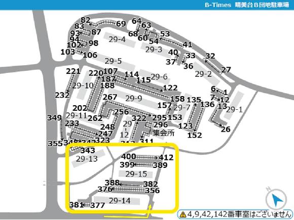 ■近隣に似た名前の団地がありますが、当駐車場は【晴美台B団地】の駐車場となっております。 ■団地内に一方通行がある場合は必ず守って走行してください。 ■現地に到着した際は、必ずタイムズのBの写真や配置図をご確認の上、駐車してください。間違って他の利用者の場所に駐車しないよう、お気を付けください。 ■団地内駐車場となりますので、アイドリング・喫煙・ポイ捨てはご遠慮くださ い <ご予約した区画に不正車両が止まっていた場合> 下記をご参照の上、空き車室の照会・振替および不正駐車情報のご入力をお願いいたします。 https://btimes.jp/guide/rent_illegalpark.html |
